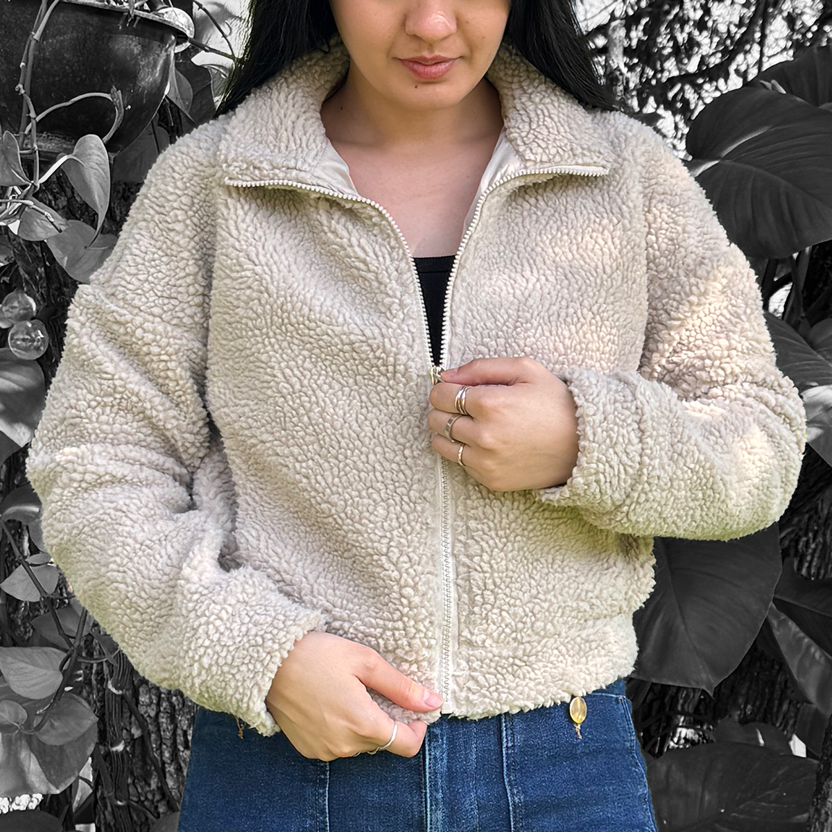 Chamarra corta en tejido teddy, ¡súper calientita! Queda estilo crop top, ¡está preciosa! Originalmente es talla M, pero yo recomiendo usarla como talla S porque sí viene reducida.