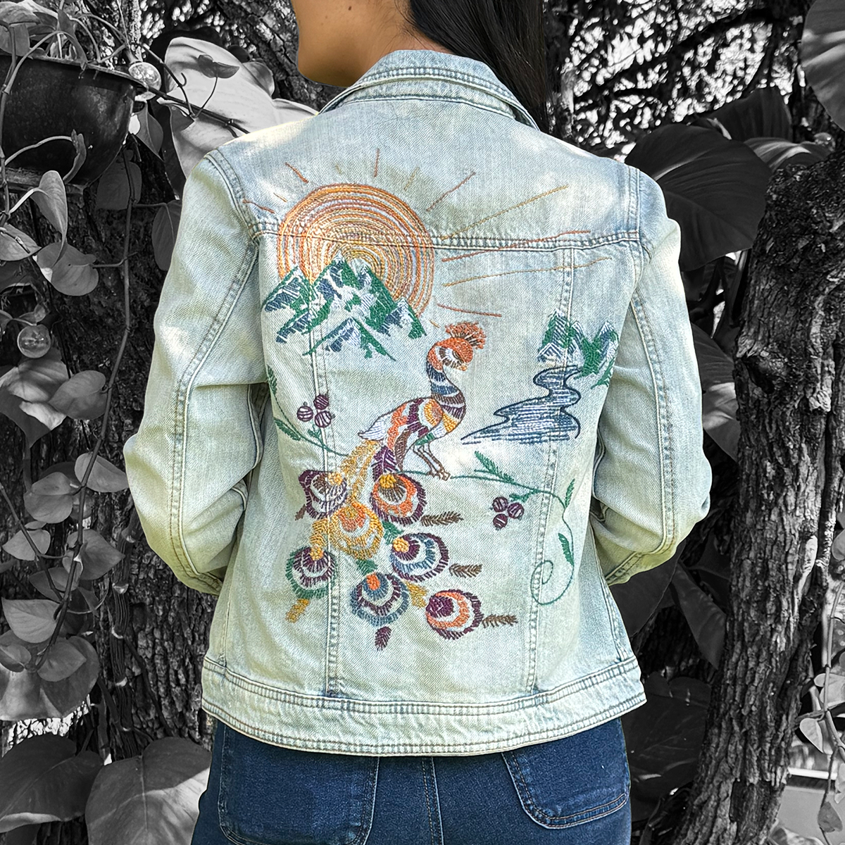 Chamarra estilo dosmilero con bordado bohemio en la espalda, ¡toda una belleza!